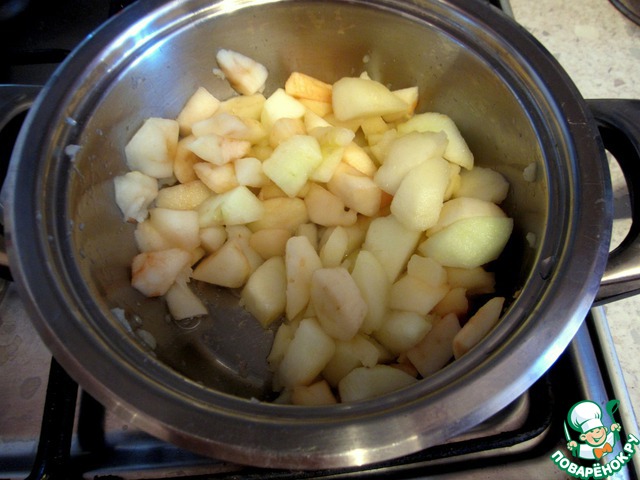 Готовим яблочный крем. Почищенные от кожуры и семян яблоки нагреваем на плите до размягчения.