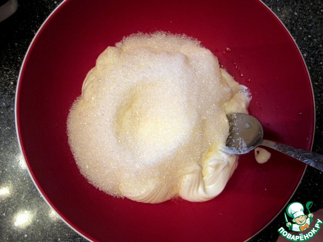 В желтки добавляем 0,5 ст. сахара и взбиваем.
