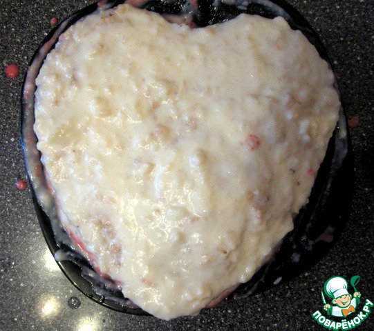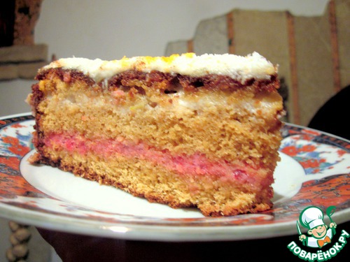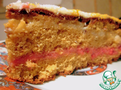 А теперь можем собирать пирожок! Бисквит я разрезала на 3 части и каждый корж пропитала смесью варенья с водой.
