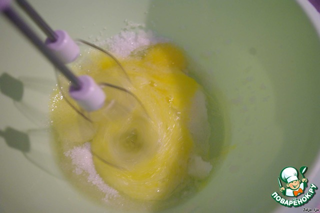Тем временем, для начинки, взбиваем два яйца с оставшимся сахаром.