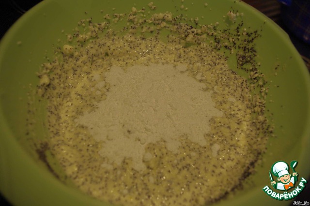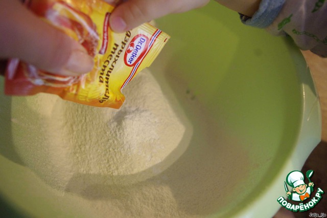 Муку просеять в миску. Добавить разрыхлитель и щепотку соли.