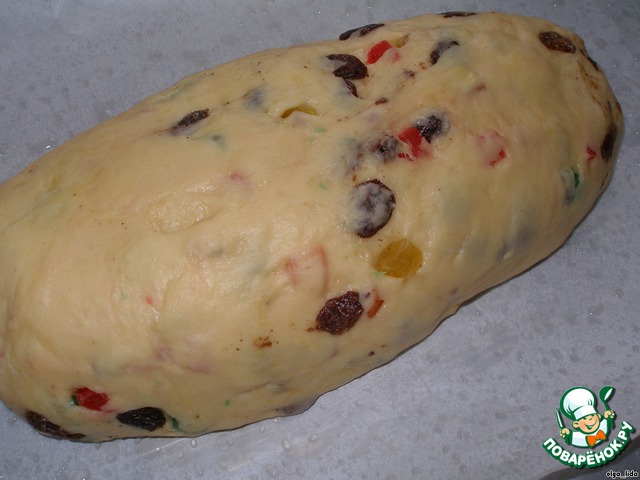 Когда тесто поднимется, вмешиваем в него изюм, цукаты, цедру. Придаём тесту форму, выкладываем на противень, смазанный маслом, и даём немного подойти.