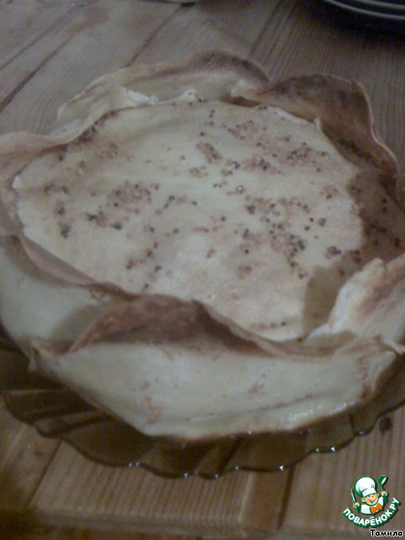 Отдельно жарим грибы, на оставшемся масле и добавляем к остальной начинке. В принципе масла можно взять меньше. Теперь собираем наш пирог. На смазанную маслом сковороду кладем один блинчик. Смазываем начинкой, накрываем следующим блинчиком, опять начинка, блинчик, начинка, блинчик и т.д. по желаемой высоте пирога.