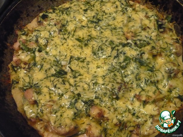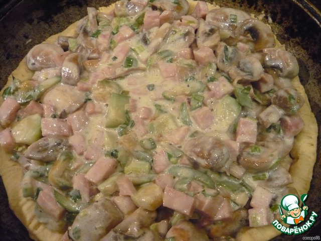 Полу готовое тесто вынуть из духовки, разложить грибную массу и выпекать еще 20 мин. при 200 гр.