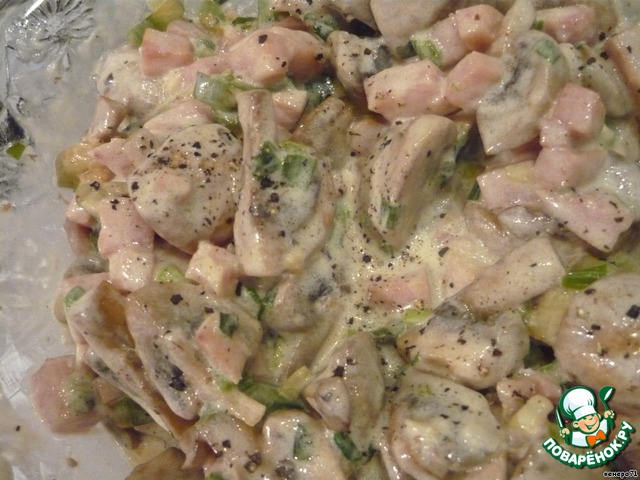 Сметану, майонез, 1 белок смешать. Грибы, ветчину и кабачок соединить, заправить соусом, посолить и поперчить по вкусу.