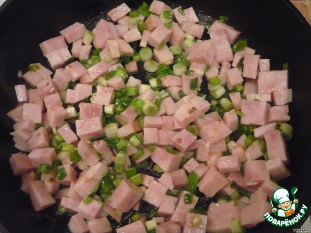 Ветчину и лук зеленый обжарить 3-4 мин. Кабачок (у меня порезанный кубиками и замороженный) тоже слегка обжарить отдельно.