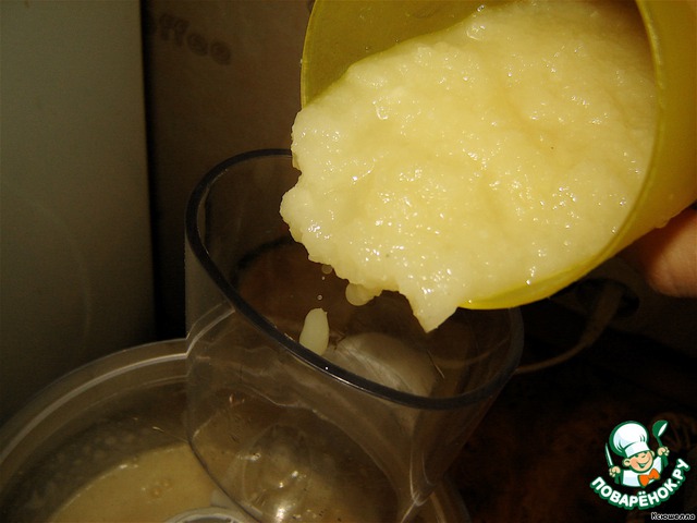 Для начала измельчаем в блендере консервированный ананас вместе с соком до консистенции пюре.