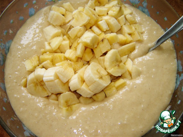 Когда смесь станет однородной, ложкой аккуратно вмешиваем порезанные на кусочки бананы.