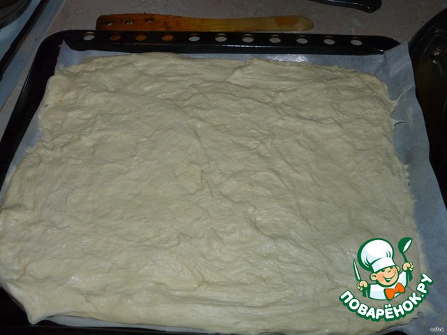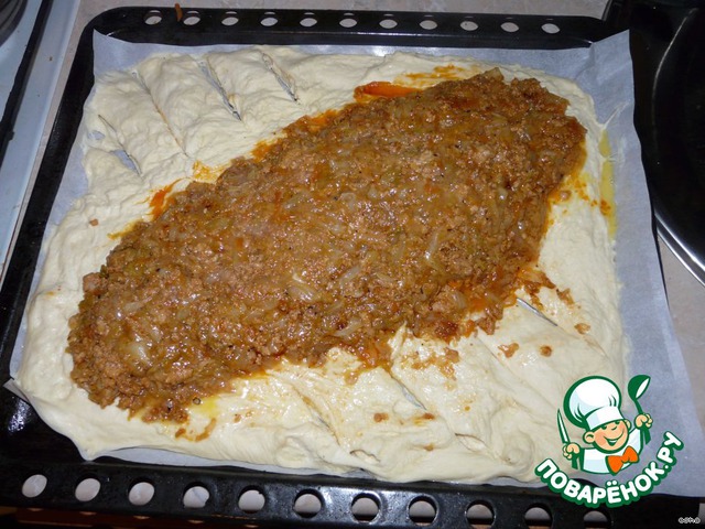 Тесто раскатать на весь противень - у меня было сдобное дрожжевое тесто, поэтому крокодил не очень-то держал форму, распухал все время как поросенок...