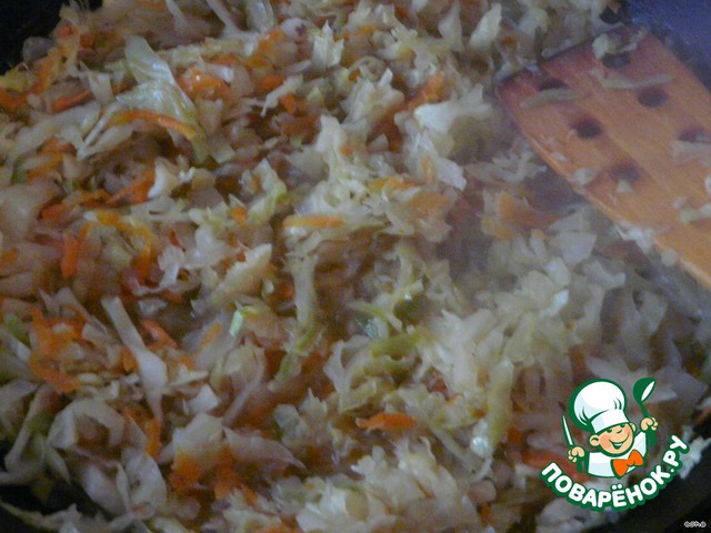 Капусту с луком, морковью потушить подольше, я воды добавляла, чтобы была не слишком жирной.