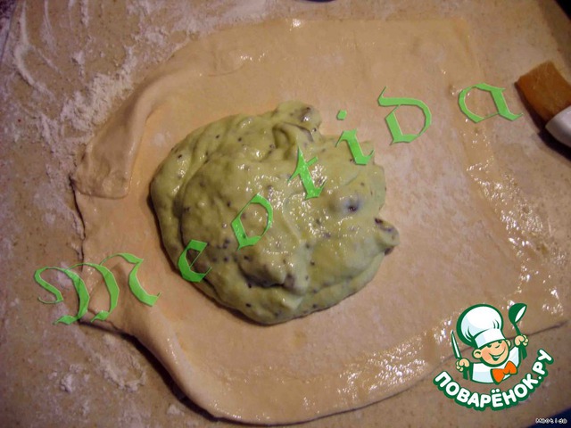 теперь на второй листик выкладываем 2/3 начинки с киви и тоже сворачиваем вареничик