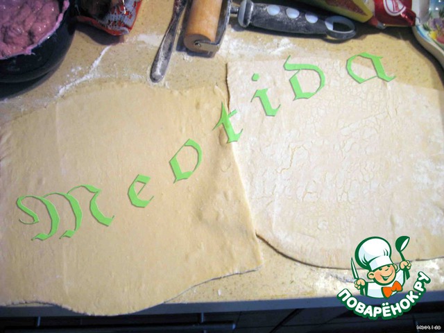у меня в упаковке два листа теста..каждый слегка раскатываем скалкой на присыпанной мукой поверхности и от каждого листика отрезаем полосочку шириной 5 см (для завязочек), горизонтально по узкой стороне