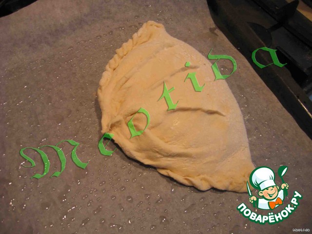 и сворачиваем тесто большим вареником, хорошенько скрептяя края, чтобы тесто не разошлось