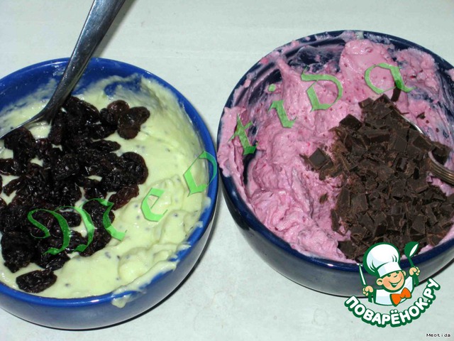 в клюковквенную начинку высыпаем измельченный шоколад, а в начинку с киви - изюмчик