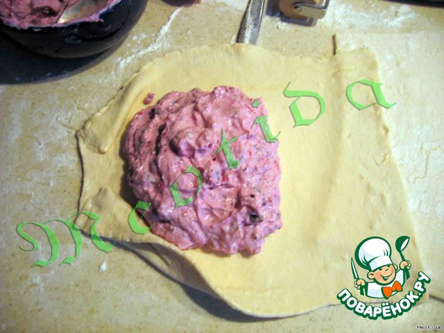 на один листик выкладываем 2/3 клюквенной начинки