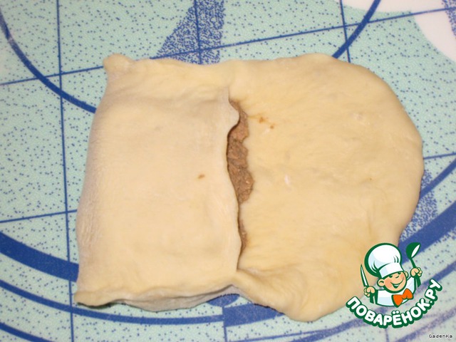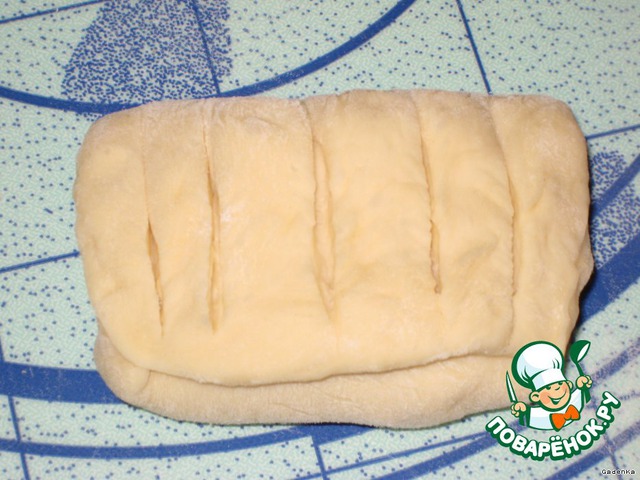 Затем завернуть поверх второй край, с боков защипать, а сверху сделать поперечные надрезы верхнего слоя.