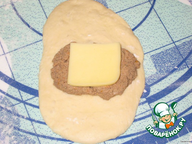 На середину лепешки выложить начинку из печени на печень положить ломтик сыра.