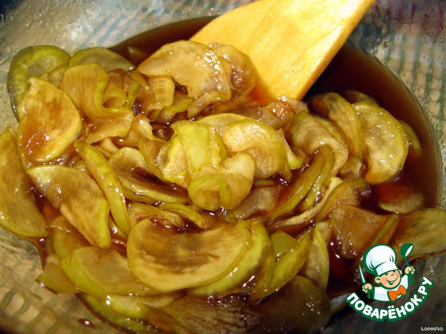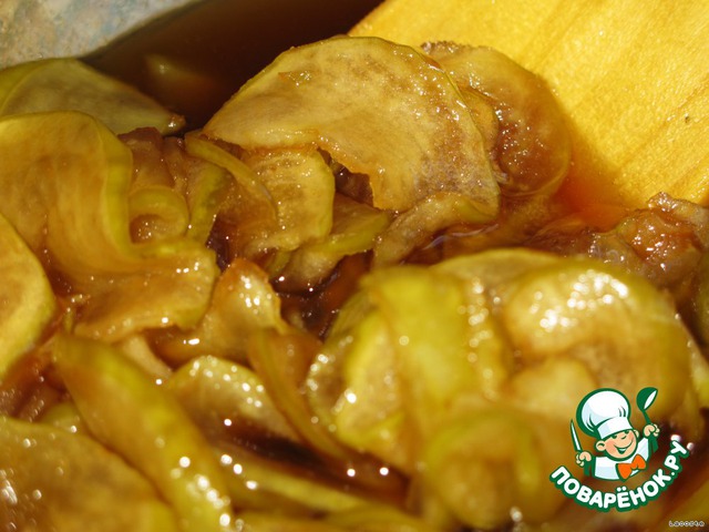 Яблоки шумовкой переложить в миску. Оставшийся в сотейнике сок продолжать уваривать еще 15 мин., затем влить в миску с яблоками и отставить. Когда яблоки остынут, добавить муку и корицу, перемешать.