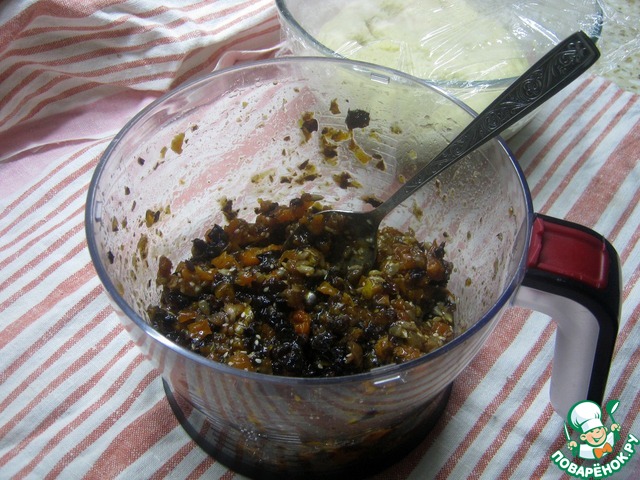 Пасту для начинки советую готовить на свой вкус. Но мне нравятся именно такие пропорции и продукты. Всё для начинки, кроме семечек и кунжута, пробить в комбайне до мелких кусочков. Как вариант - провернуть в мясорубке. Но мне почему-то пробитые сухофрукты кажутся вкуснее и ярче. Добавить к пасте поджаренные семечки с кунжутом.