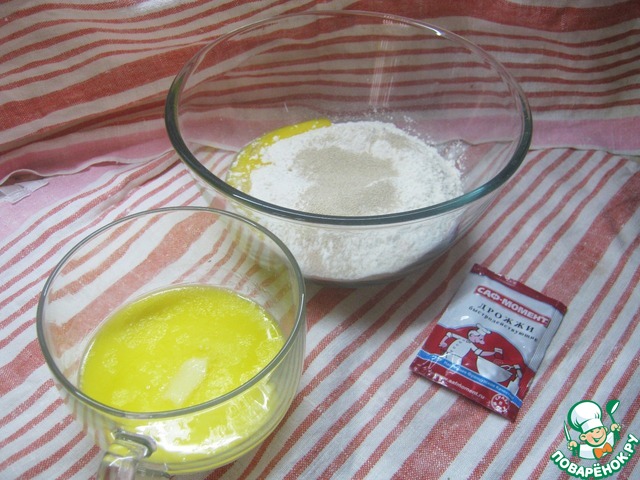 В общем, сказали нам дружно кушать пасту Амосова, но как-то она не пошла. И пришла мне в голову светлая идея заточить пасту в пирог. Итак, берем муку, дрожжи и соль, перемешиваем. В молоке растворяем сахар, добавляем это к мучной смеси. Также добавить растопленное масло и жёлток (белок пока отложить). Замесить тесто и убрать его в тёплое место на 1 час для подъема.