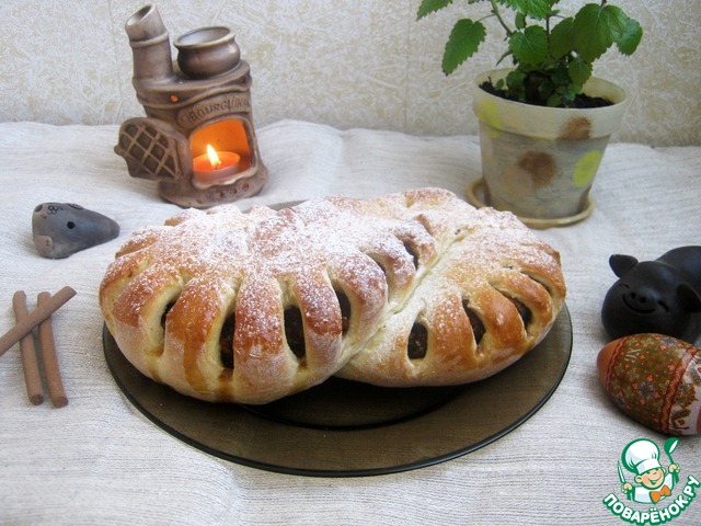 Смазать пирог оставшимся белком, отправить в духовку приблизительно на 30 минут (до румяной корочки). Украсить сахарной пудрой.
