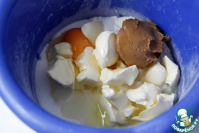 Все составляющие теста: 100 г сахара, 250 г полбовой муки, яйцо, размягчённое сливочное масло, арахисовую пасту сложить в одну ёмкость.