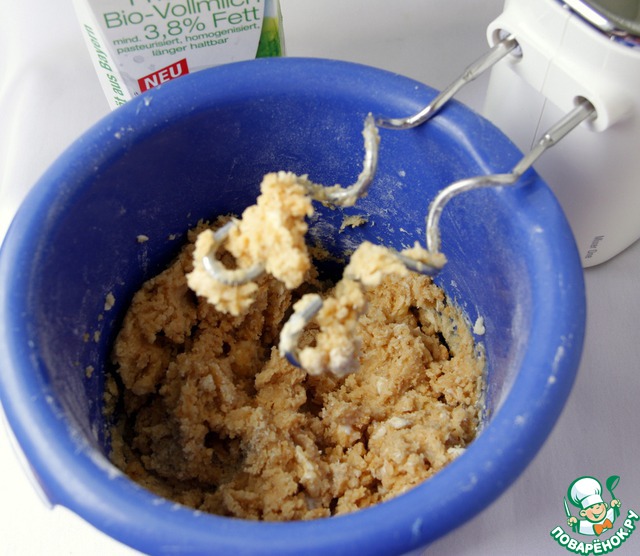 Вымесить до однородности миксером, спиральными венчиками, добавив 1 или 2 ст. л. молока.