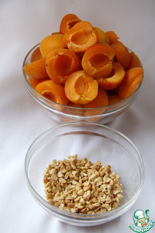 В это время очистить поджаренный арахис (я купила уже готовый, поджаренный в скорлупке) и порезать его кусочками. Помыть абрикосы, разделить на половинки, удалить косточку.
