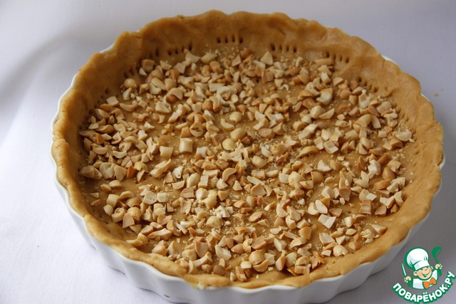 Охлаждённое тесто разделить на части: 2/3 и 1/3. 2/3 теста раскатать в форме для запекания и поднять края, формируя бортик в 3 см, часто наколоть вилкой. Тесто имеет кремовую текстуру, так что прекрасно распределяется по форме.