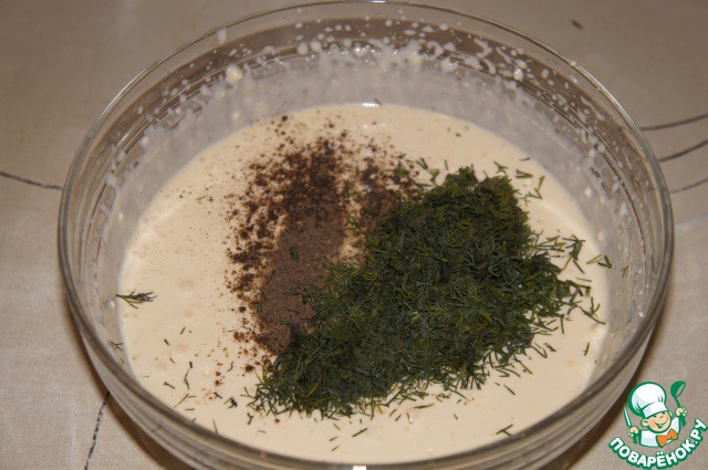Смешать миксером на самой маленькой скорости все компоненты, взбивать не надо. Добавить соль, перец и зелень по вкусу.