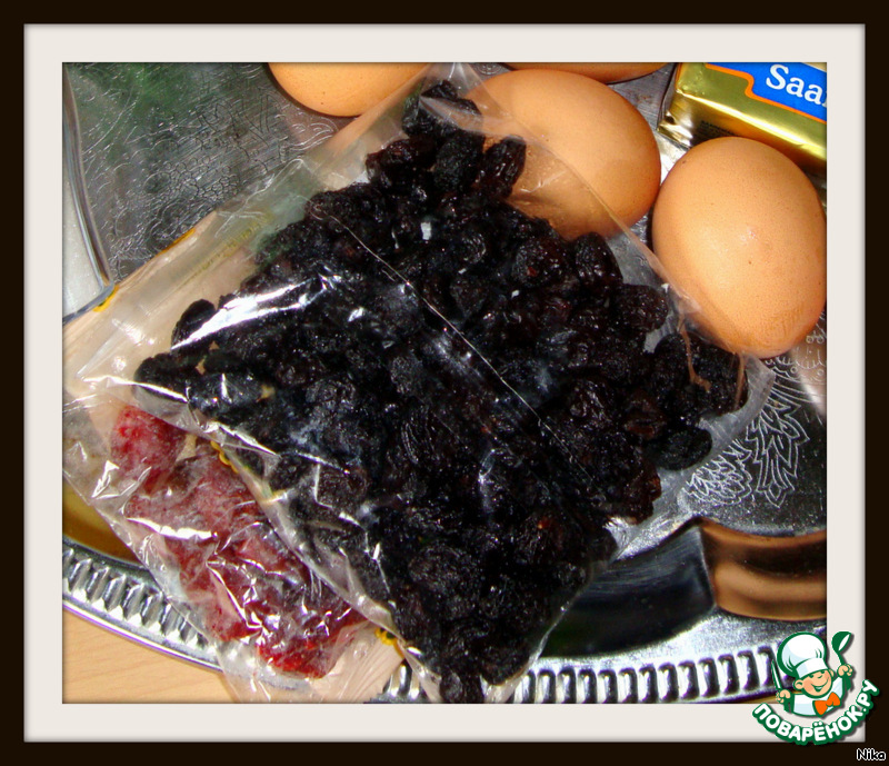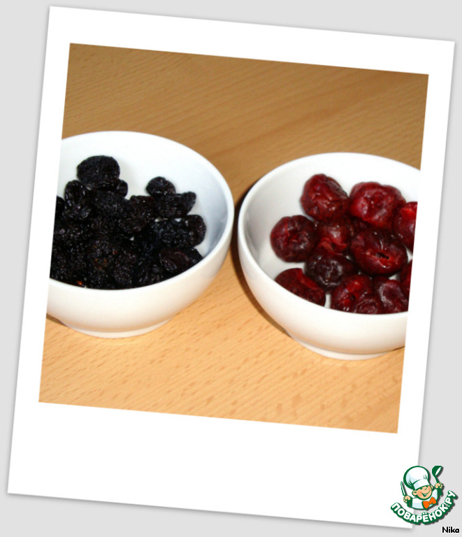 Вышня слишком крупная и я её разрезала ножницами на 4 части. Изюм чуть меньше вишни, его разрезала пополам. (В оригинальном рецепте был только изюм ).