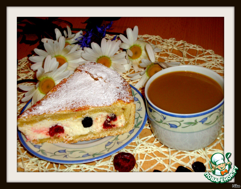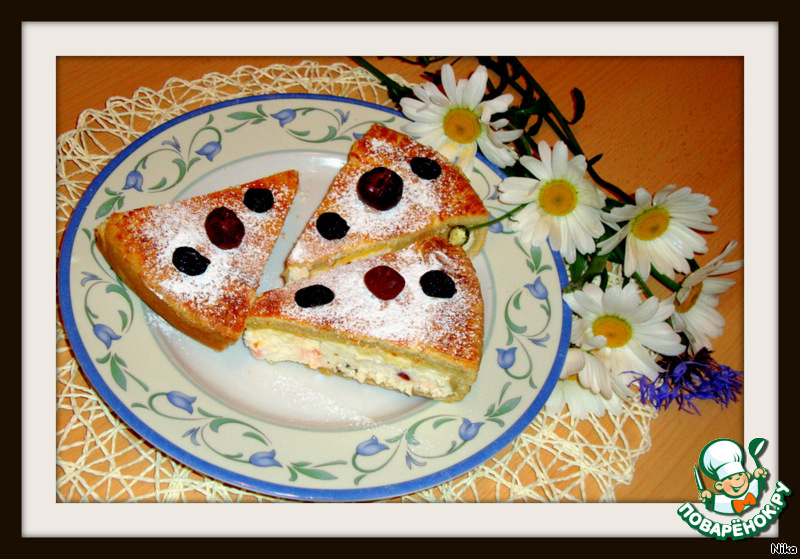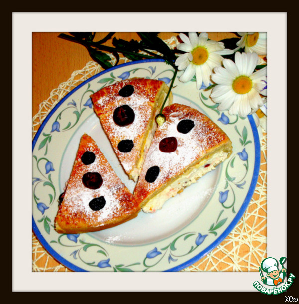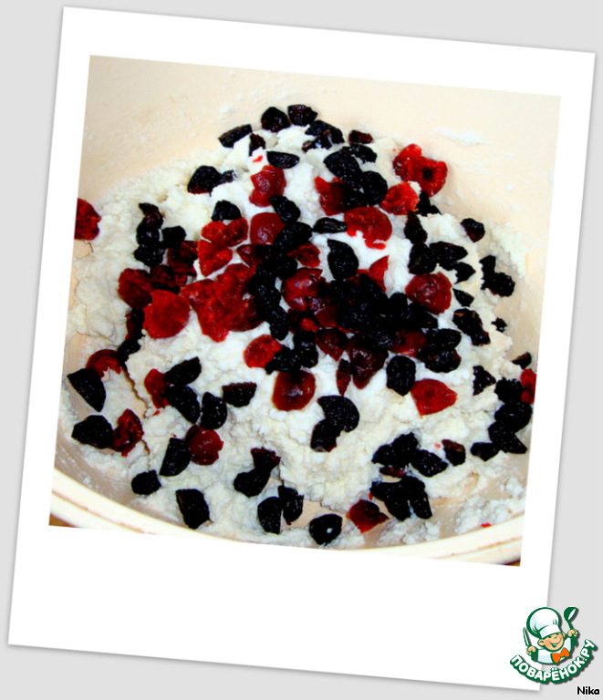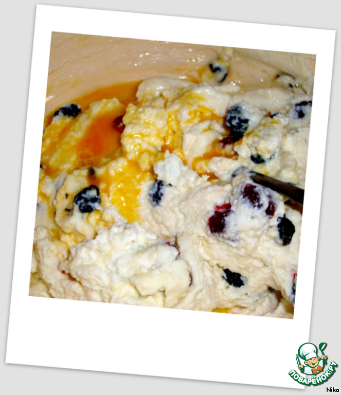 Рикотту перемешала с сахаром, ванилином, вишней, изюмом, цедрой