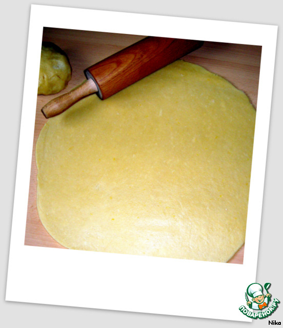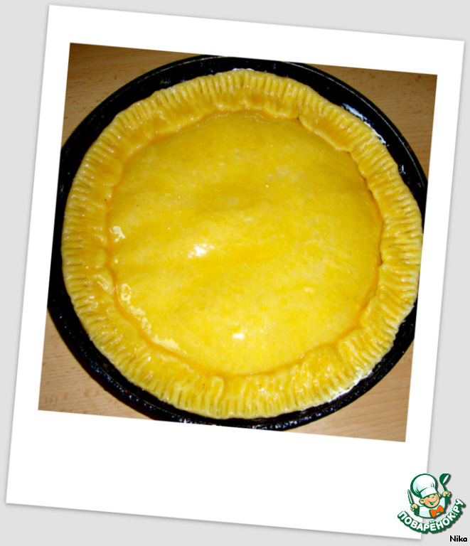 Верхней частью закрыла рикотту и смазала одним желтком. Прикрыла фольгой ( это не обязательно ) и поставила на нижнее деление выпекаться в разогретую до 180 гр. духовку. Через 20 минут фольгу сняла и переставила пирог на среднее деление тоже на 20 минут. В оригинале пирог выпекается по времени меньше и температура 150 гр.в. Но у меня пока ещё старая духовка с 86 -го года и температура не точная.