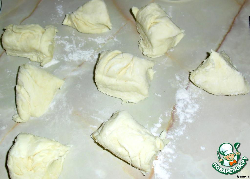 Из каждого кусочка формируем пирожок, внутрь кладём начинку.