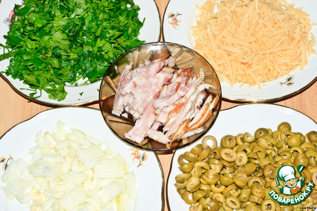 Натереть сыр, нарезать лук и чеснок, оливки нарезать кружками, листья петрушки порубить, бекон нарезать тонкими полосками.