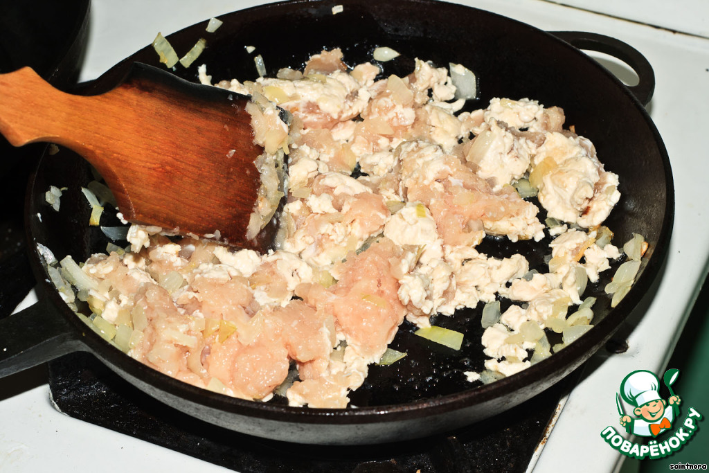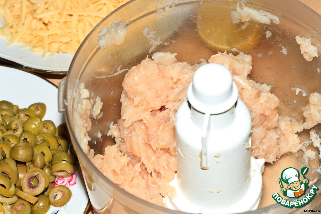 В рецепте указано "рубленное мясо". Я порубила филе курочки в комбайне.