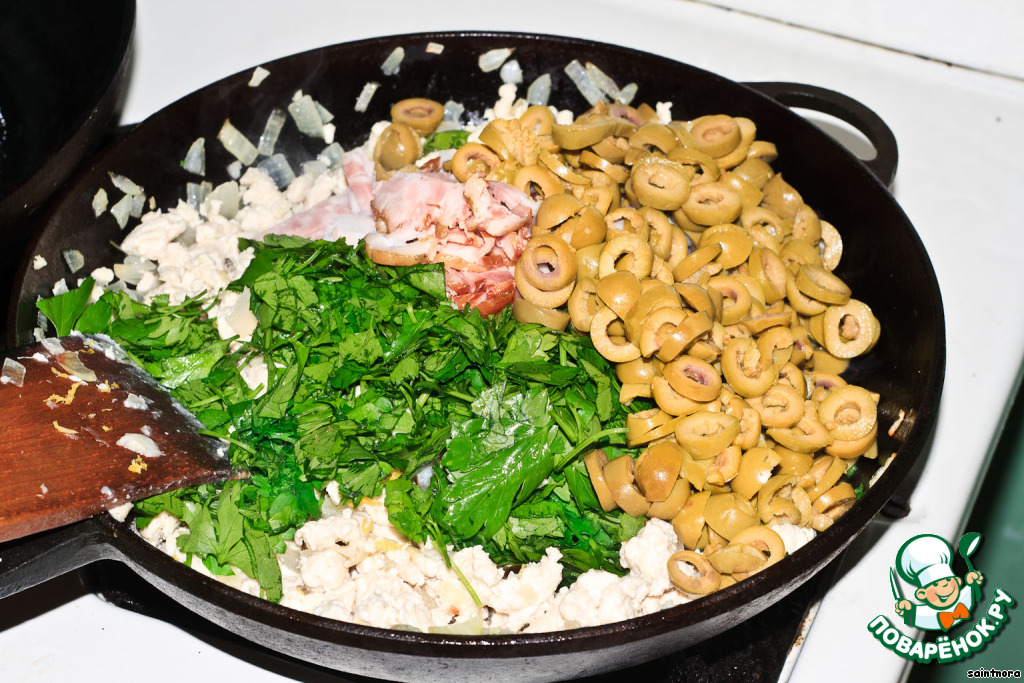 Добавить оливки, петрушку, бекон, томатную пасту, тертуюю цедру лимона, тимьян. Перемешать и сразу же снять с огня.