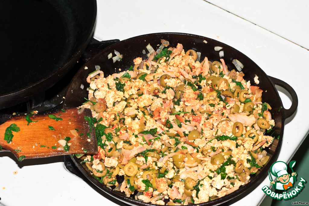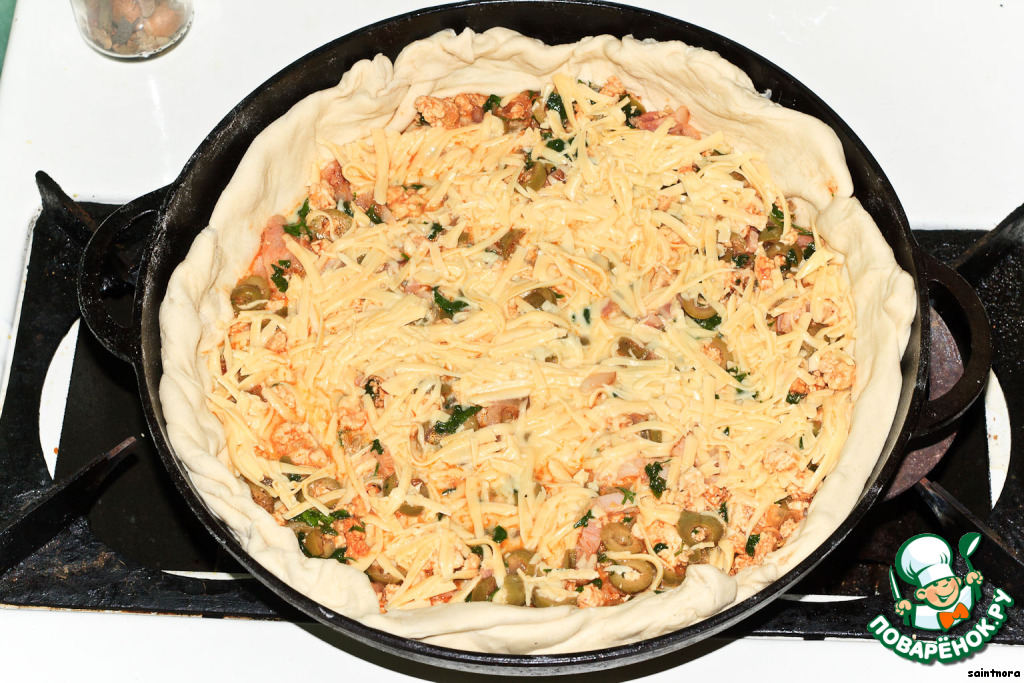 Раскатать тесто и выстлать им форму для выпекания (в моем случае сковорода)), сделать бортики в 4 см высотой. Выложить начинку и залить яичной смесью Выпекать 45 минут в духовке при 200 градусах.