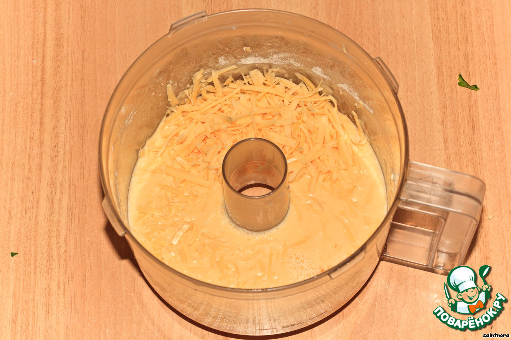 Взбить яйца с молоком, добавить муку и сыр, перемешать.