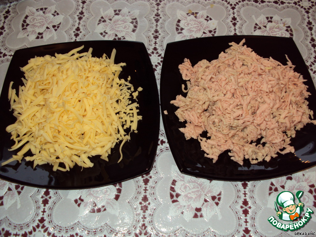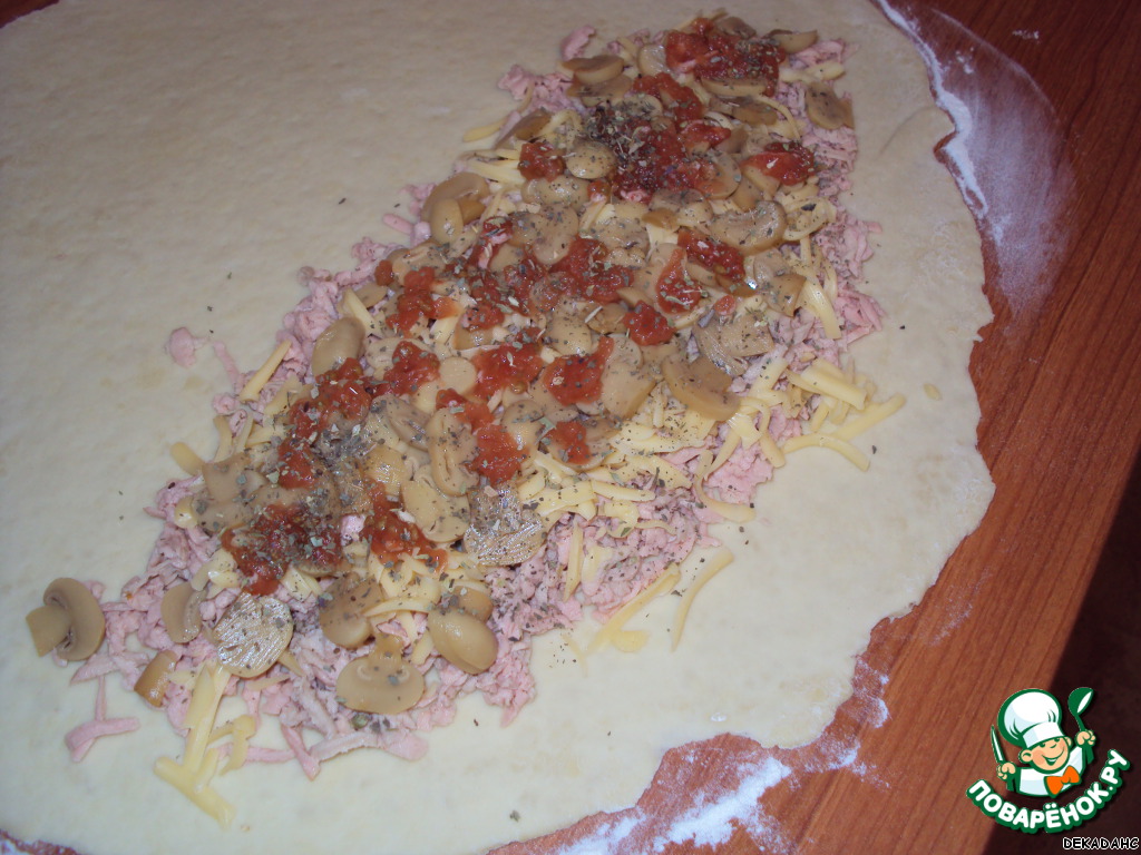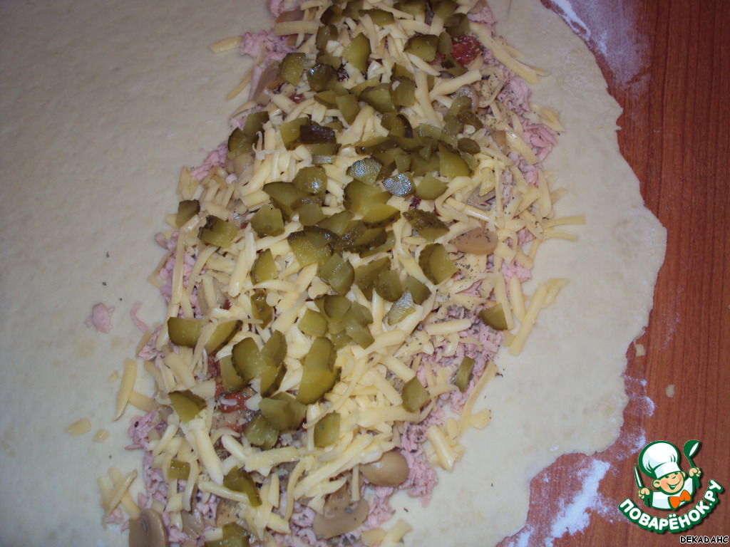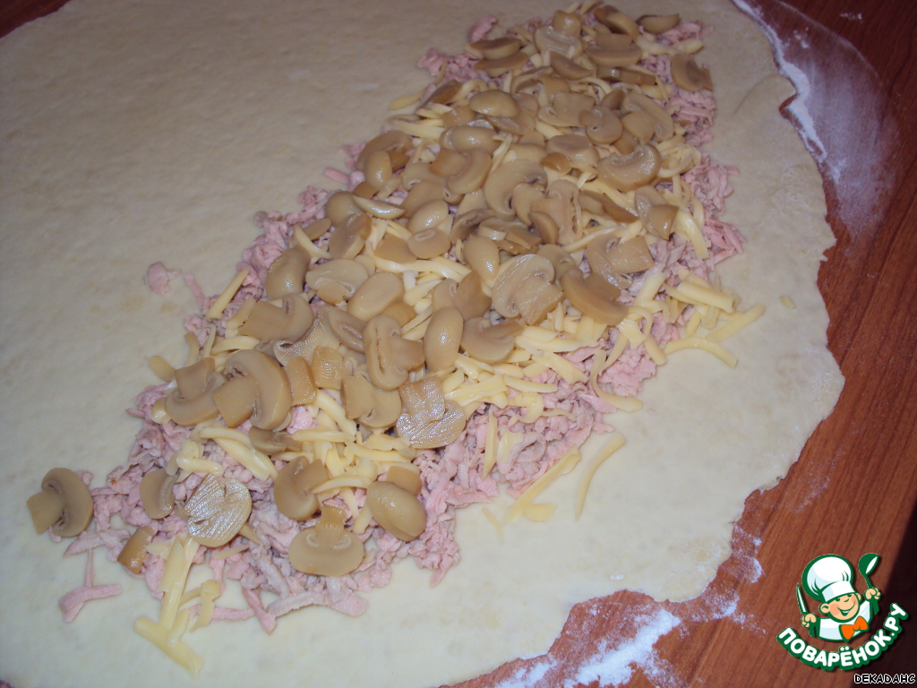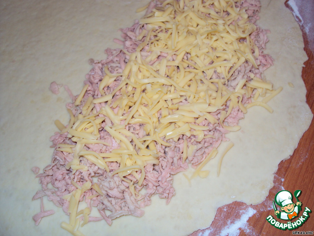 На половину теста выложить тертую колбаску (можно просто порезать, но так на мой взгляд нежнее).