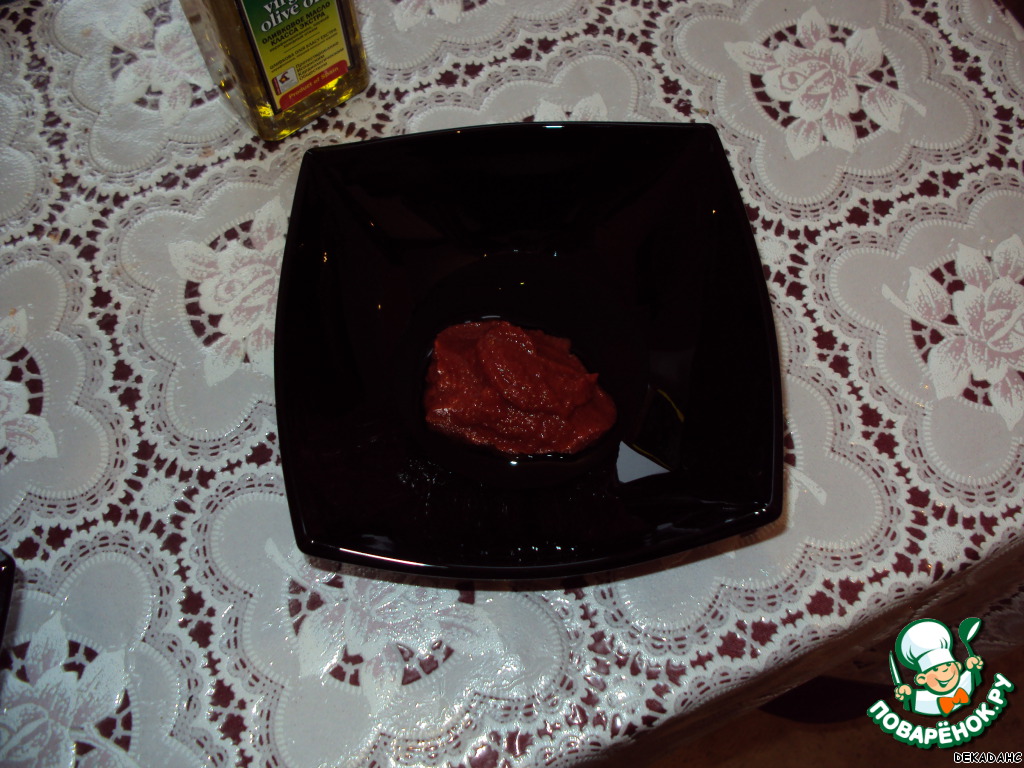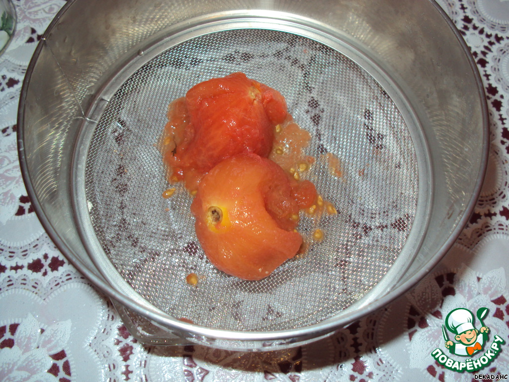 Томаты протереть через сито. Лишнюю жидкость слить. Если не любите кислинку в выпечке, можете томаты заменить на свежие.