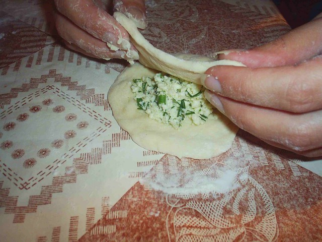От теста оторвать два примерно одинаковых кусочка, размять в лепёшки. На одну положить начинку, второй накрыть, прижать края, чтобы лепёшки слиплись. С одной стороны вытянуть "уши".