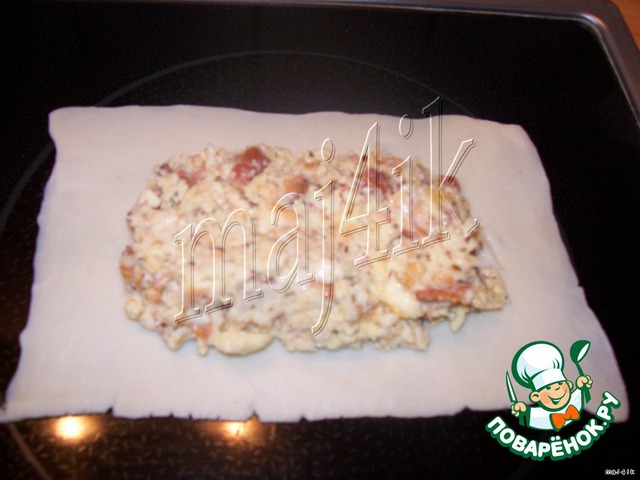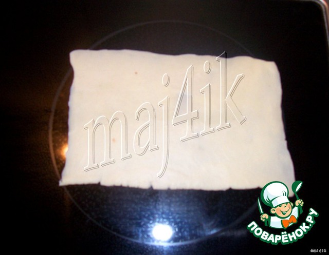 Тесто разморозить, очень тонко раскатать и разрезать на прямоугольнички.