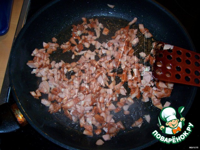 Колбаску нарезать маленькими квадратиками и обжарить.