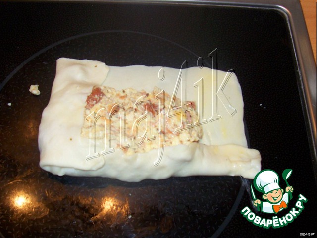 и заворачиваем как блинчики, предварительно смазав внутреннюю сторону теста желтком.