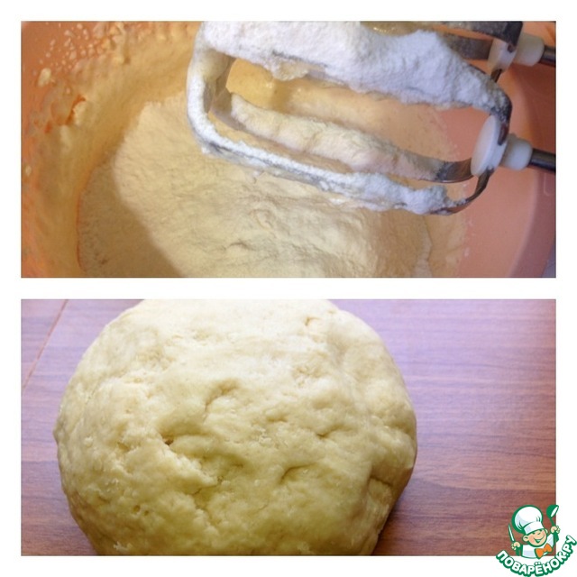 Добавить разрыхлитель и стакан муки, взбить. Далее муку добавляем постепенно и вымешиваем эластичное тесто руками. Муки может понадобится меньше или больше, в зависимости от муки и сметаны. Тесто должно быть нежным и эластичным, слегка липнуть к рукам. Не надо забивать его мукой.