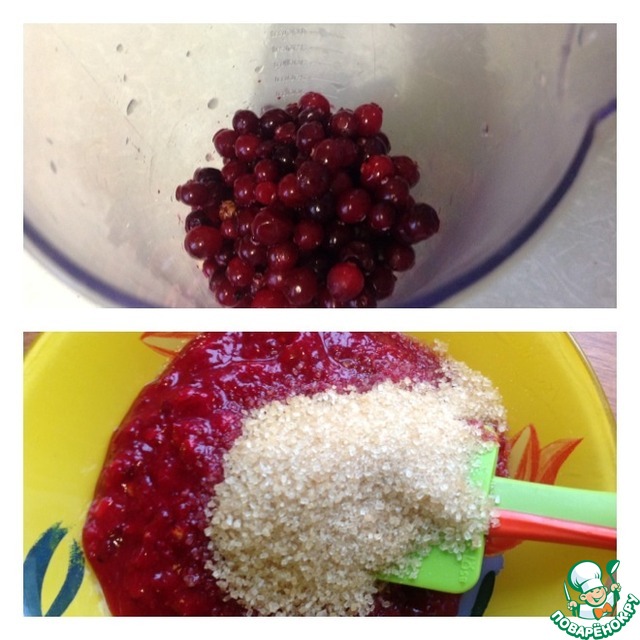 В блендер выложить лимон и клюкву. Взбить все до состояния пюре и переложить в миску. Добавить стакан сахара и тщательно перемешать нашу начинку.