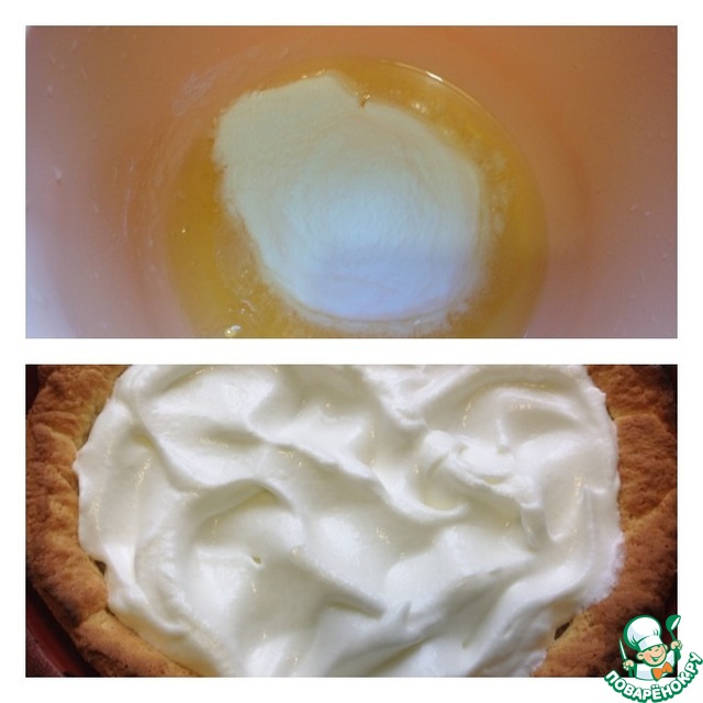 Белки взбить с сахарной пудрой до твердых пиков. Готовый корж достать из духовки и сразу же нанести взбитые белки