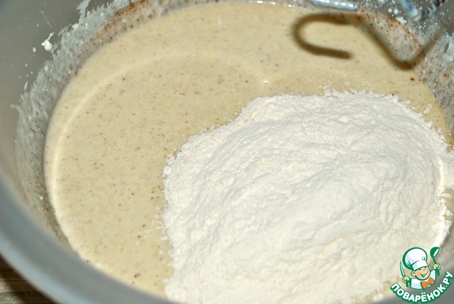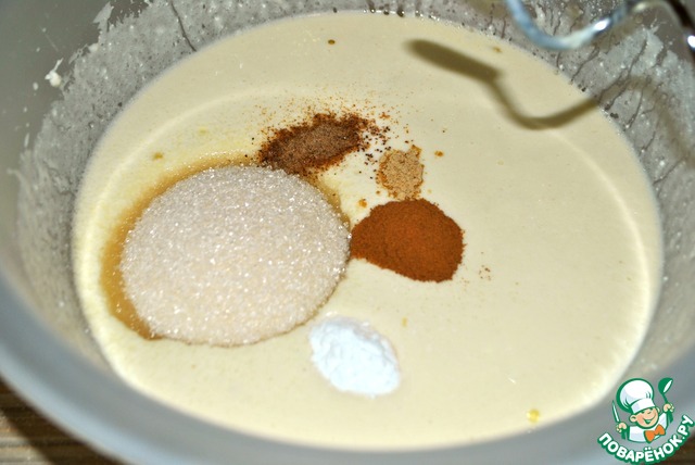 6) Добавляем сахар, специи, соду (сода нужна для того, чтобы тесто не кислило) и цедру апельсина (о которой я забыла), перемешиваем.