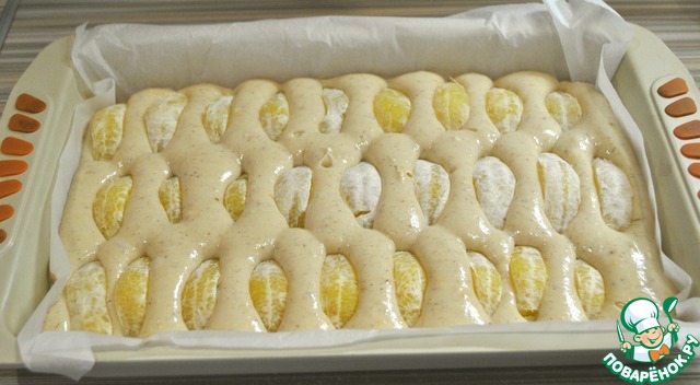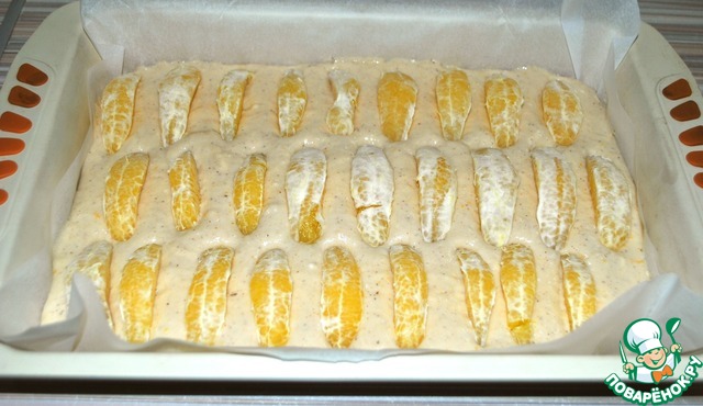 10) Затем выливаем его в форму 33 х 22,5 см., застеленную пергаментом. Укладываем дольки апельсина. У меня ушло чуть меньше трех апельсин. Затем накрываем форму пищевой пленкой, смазанной с внутренней стороной растительным маслом.